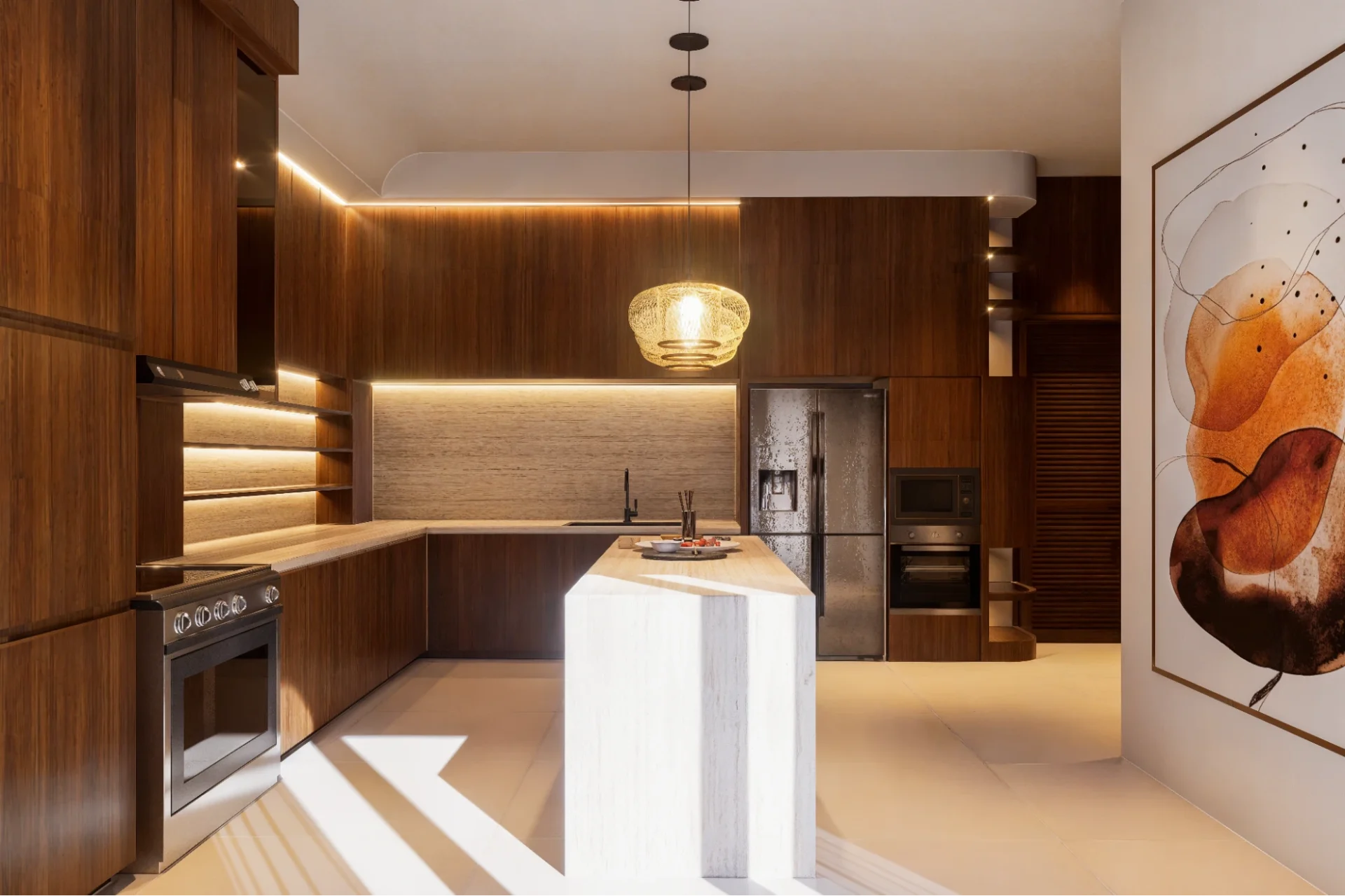 When you get inside of this luxury villa interior design, your experience is where the story truly comes alive. The kitchen, dining, and living areas are designed as one continuous space. There are no harsh separations, just a natural flow that makes this property feel larger and more connected.