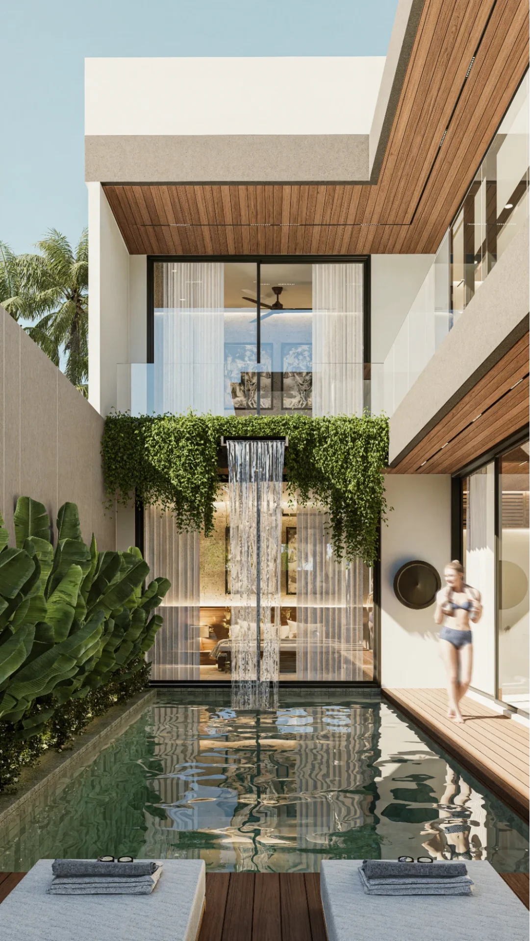 In the evening, softer, indirect lighting takes over, creating a more intimate and relaxed atmosphere. And then there is the waterfall feature, flowing from the balcony down to the pool. From the inside, it becomes part of the daily experience, not just something you see, but something you hear and feel. It adds a quiet rhythm to the villa, reinforcing that sense of calm and renewal.