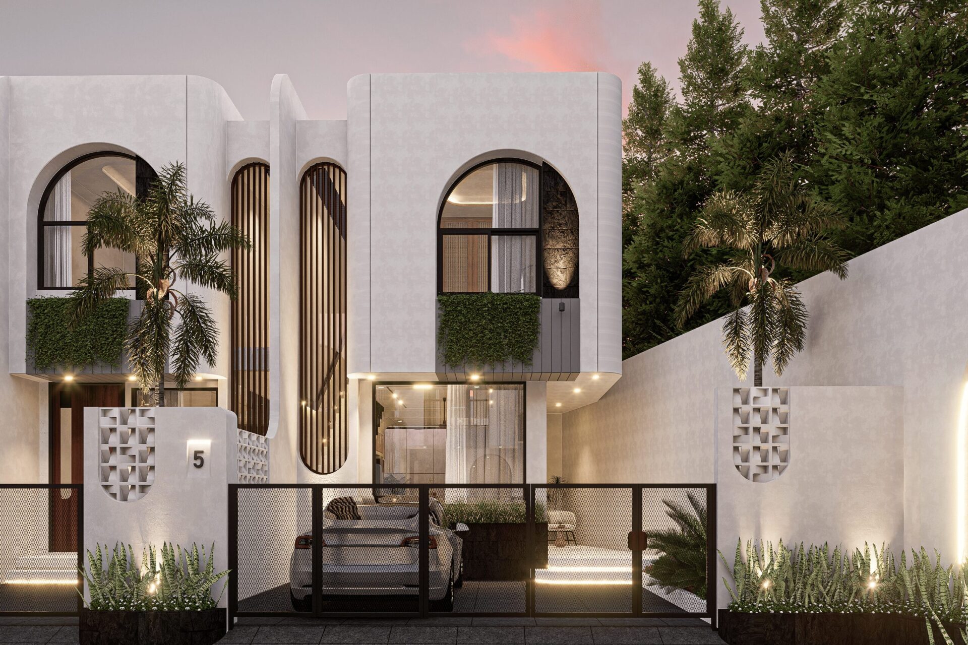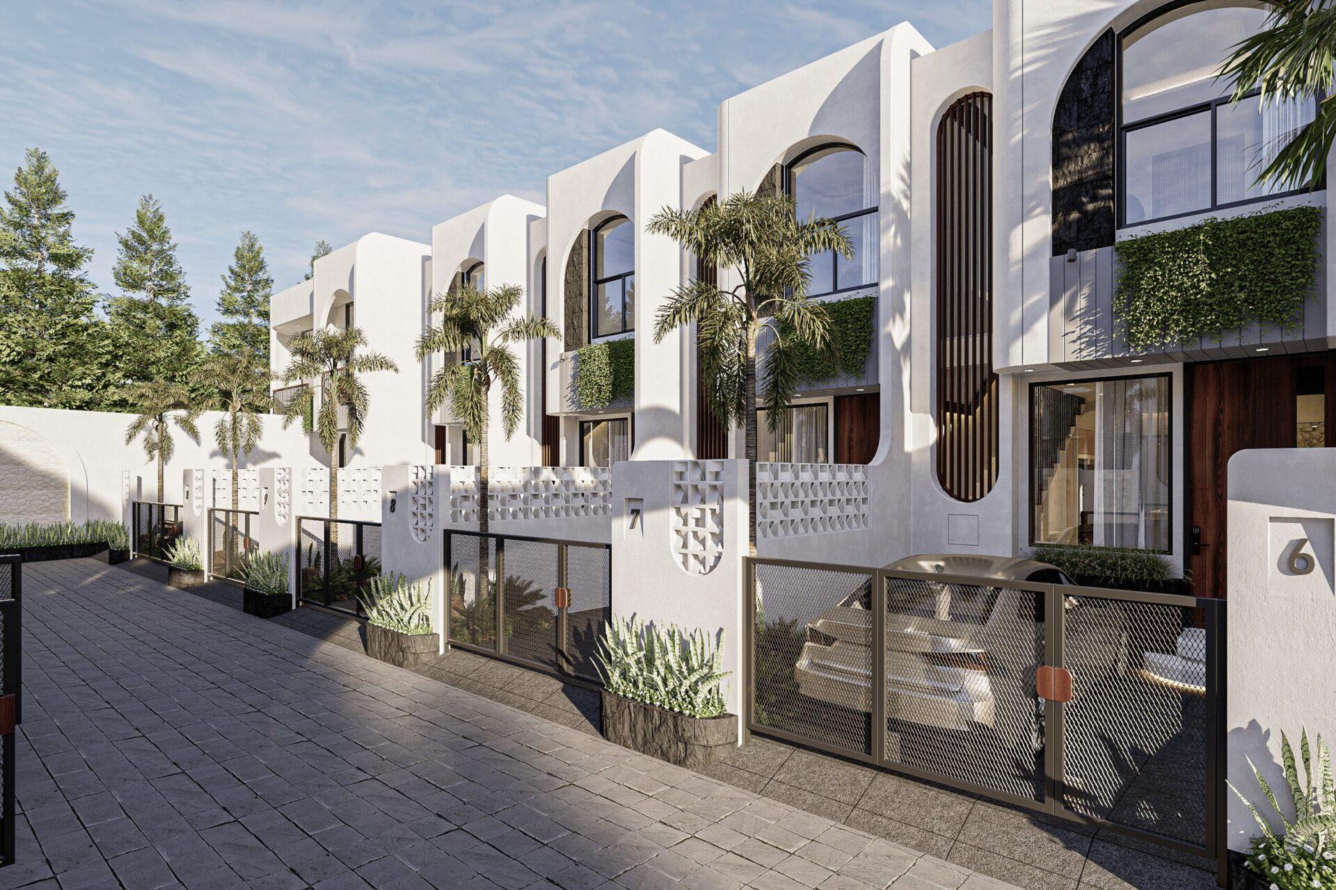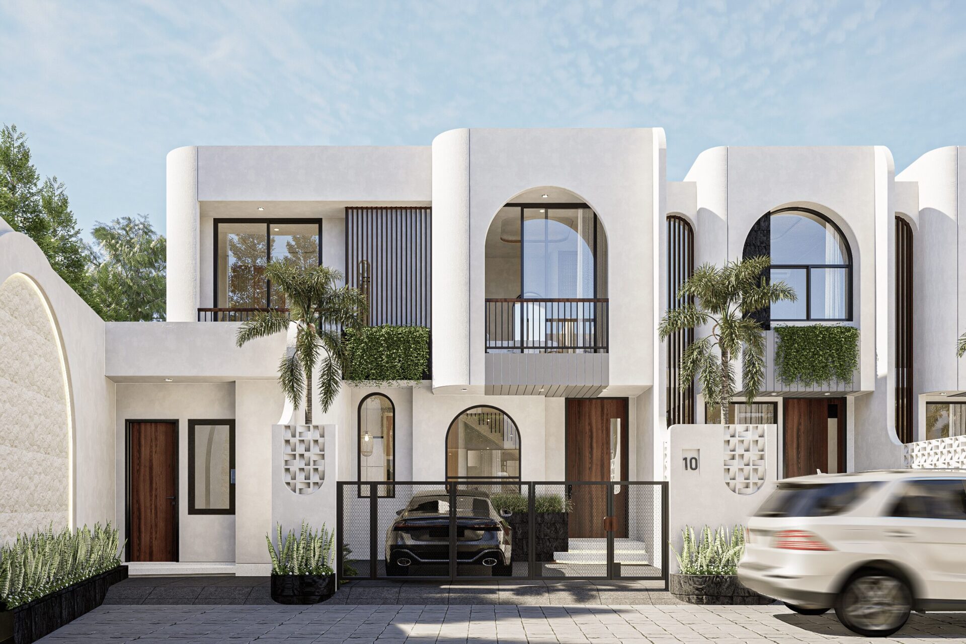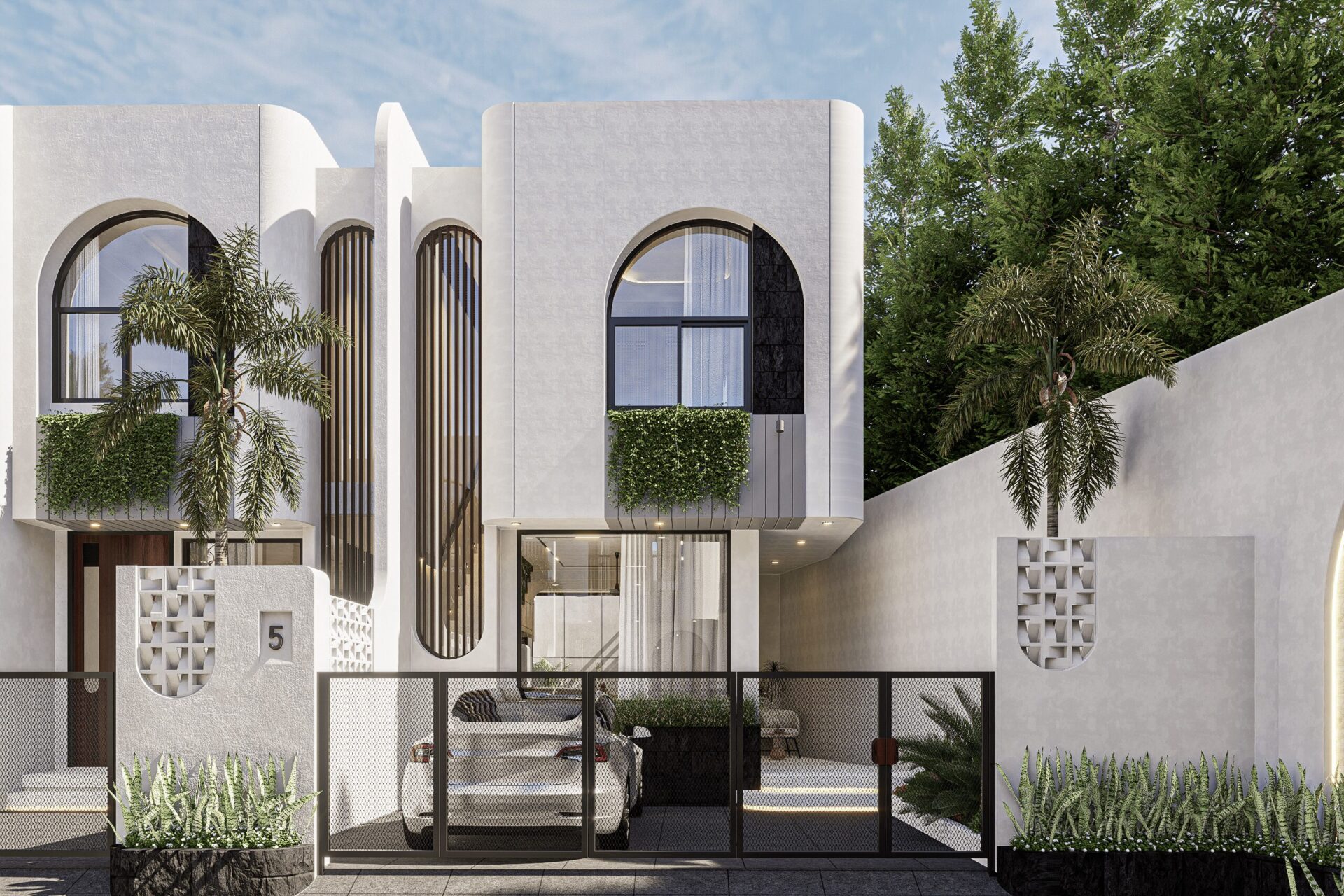 Drawing inspiration from Mediterranean serenity, this architecture features textured white walls that catch and reflect light beautifully, creating an elegant yet approachable facade. This neutral backdrop becomes a living canvas where light, shadow, and form interact gently throughout the day, infusing every space with quiet energy and grace.