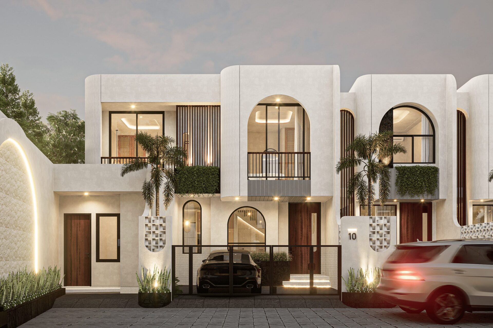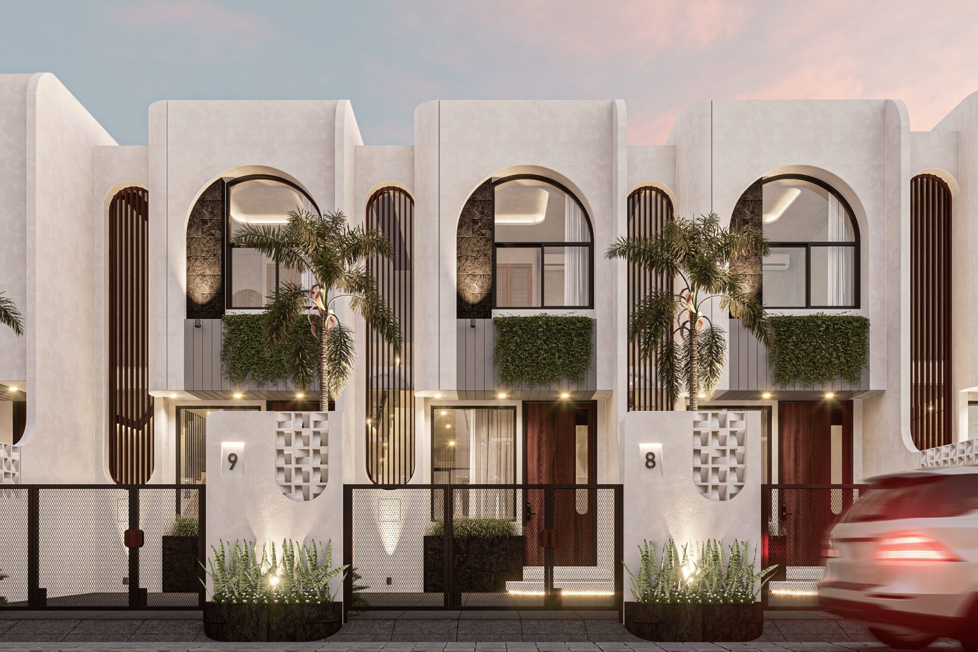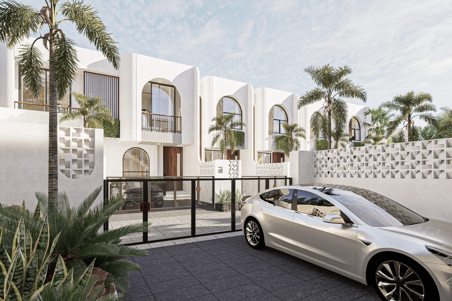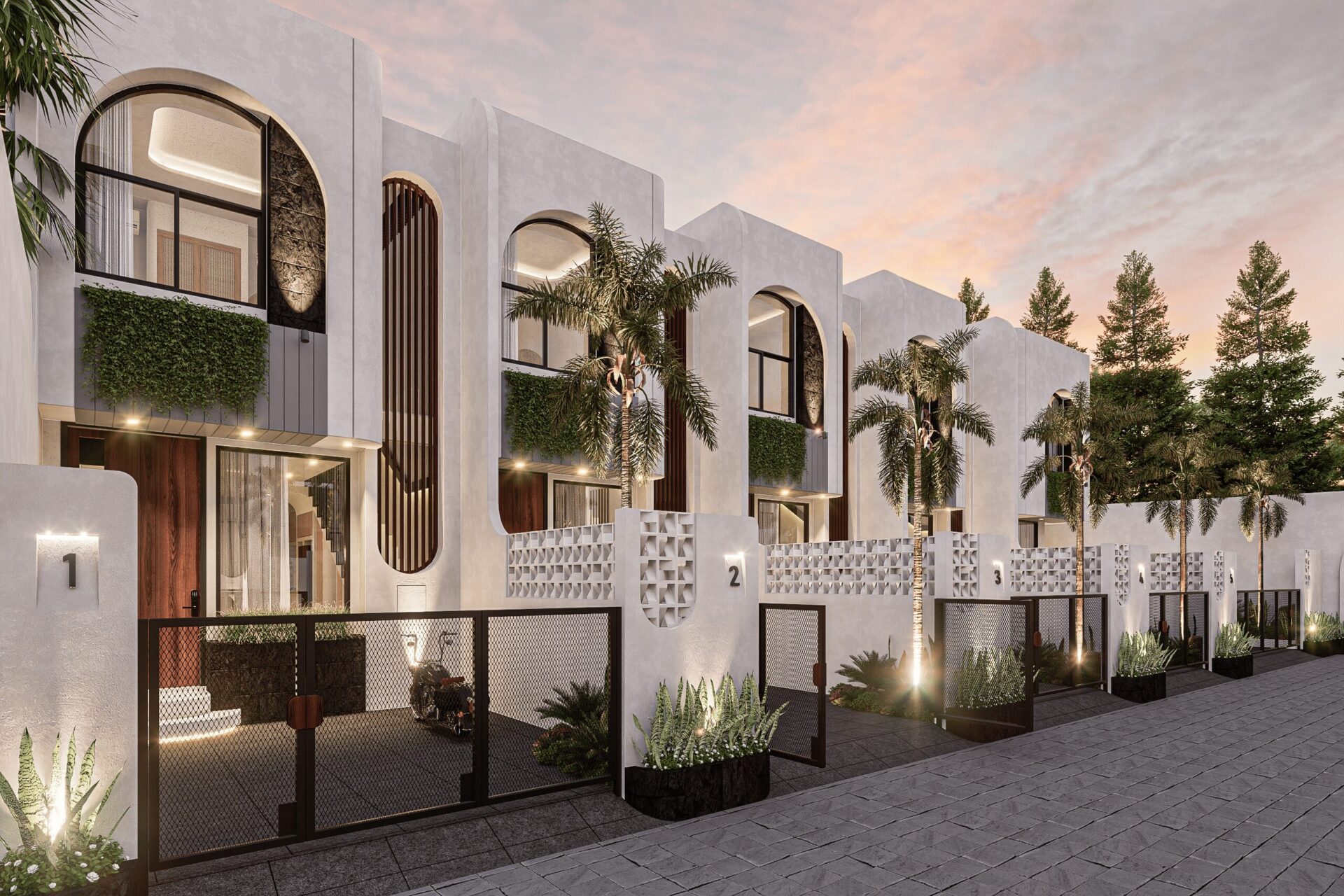 Drawing inspiration from Mediterranean serenity, this architecture features textured white walls that catch and reflect light beautifully, creating an elegant yet approachable facade. This neutral backdrop becomes a living canvas where light, shadow, and form interact gently throughout the day, infusing every space with quiet energy and grace.