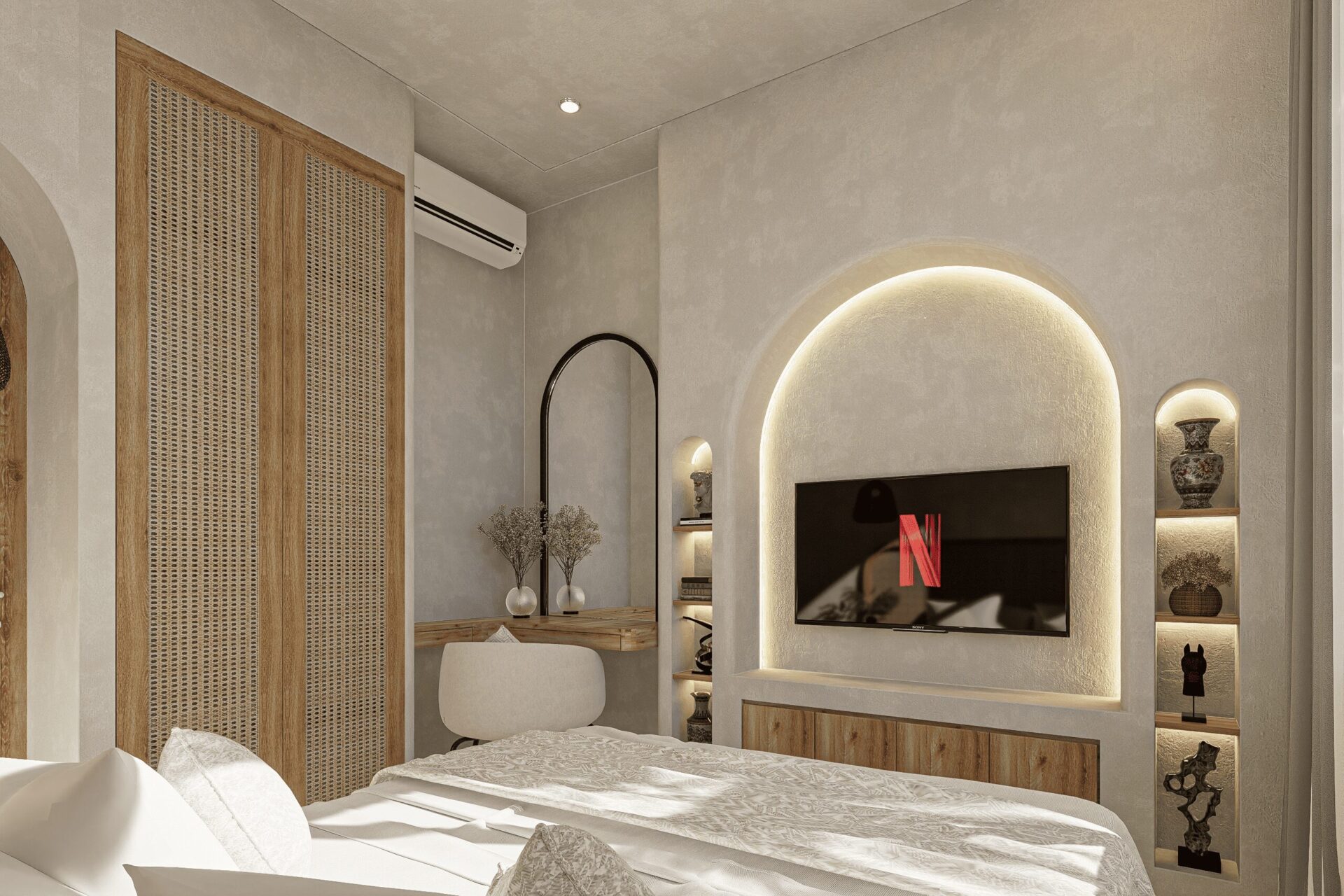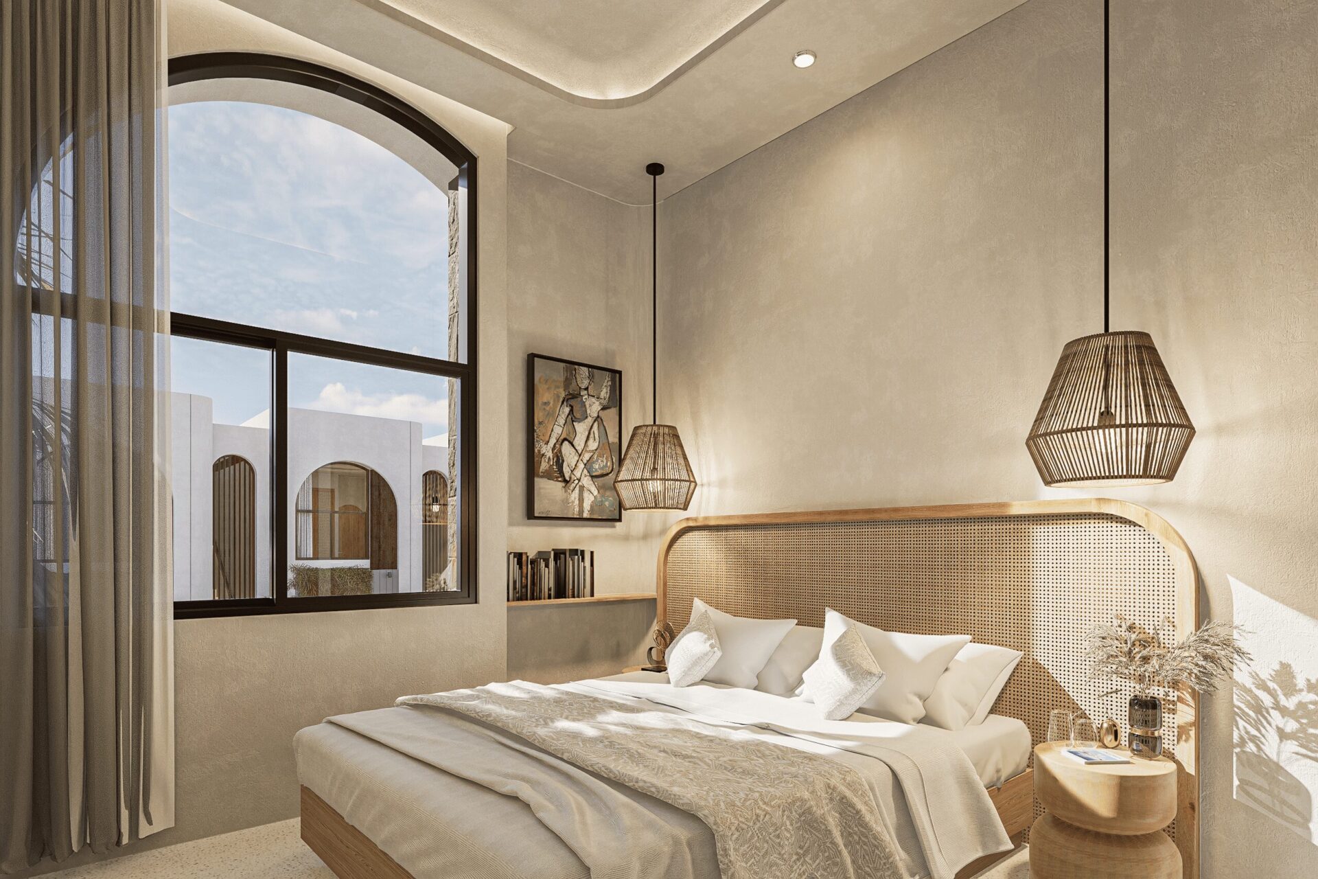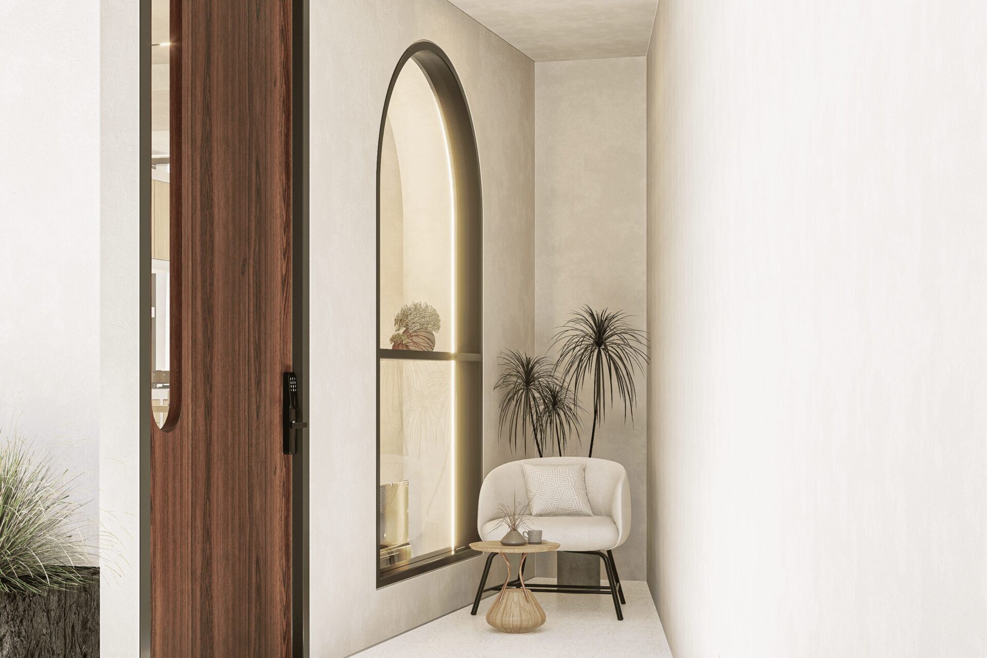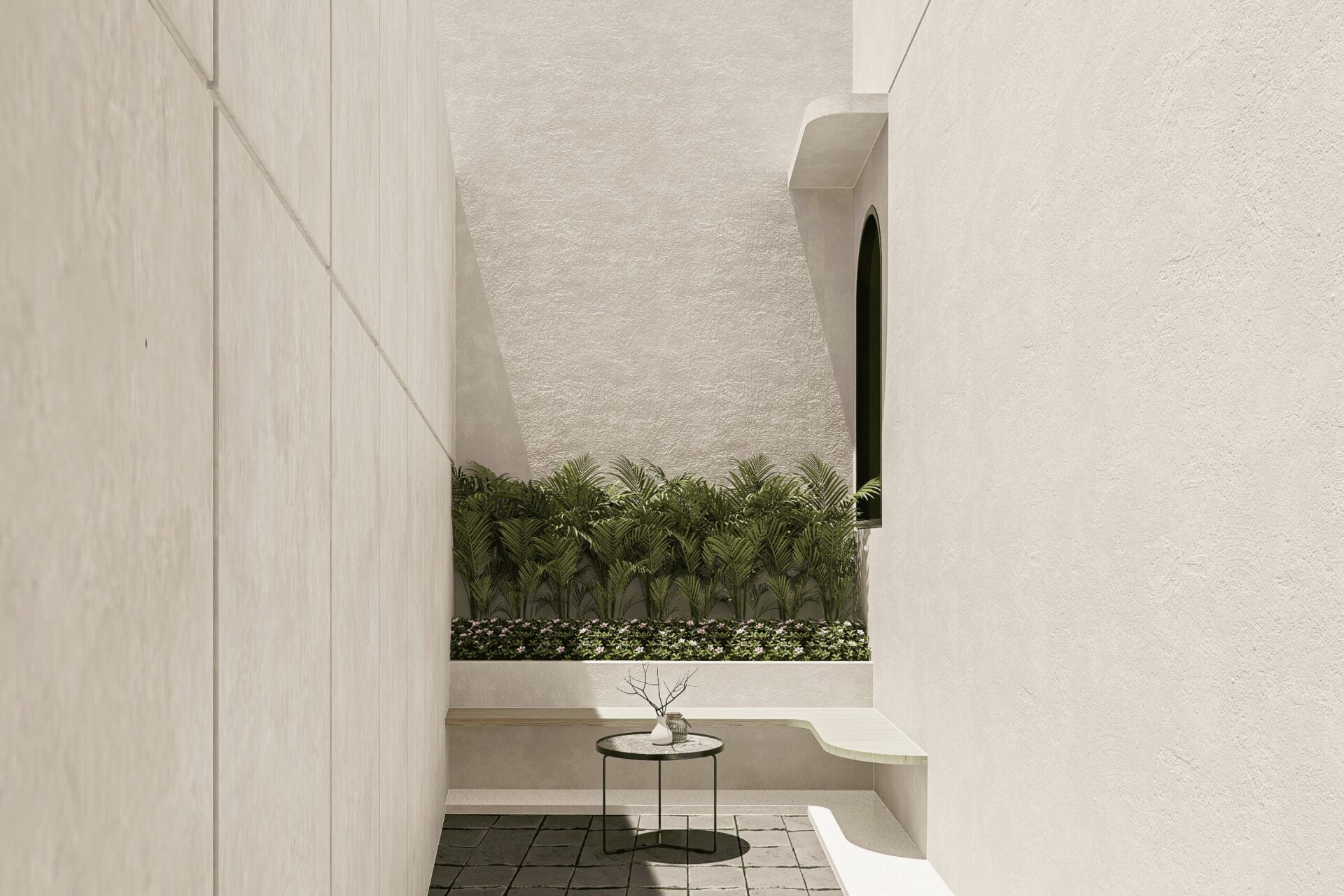 Drawing inspiration from Mediterranean serenity, this architecture features textured white walls that catch and reflect light beautifully, creating an elegant yet approachable facade. This neutral backdrop becomes a living canvas where light, shadow, and form interact gently throughout the day, infusing every space with quiet energy and grace.