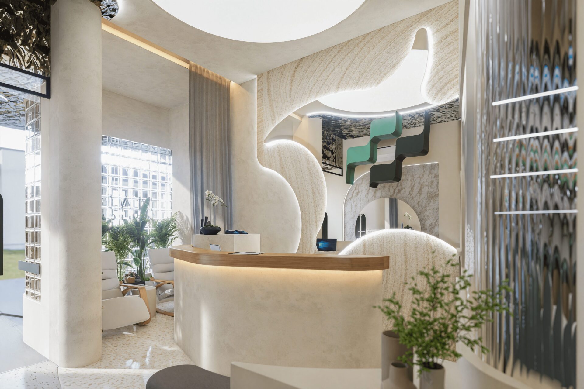 Drawing inspiration from the movement of Manta Ray is guided by curved ceilings, fluid floor lines, and a sculpted reception backdrop. This biomorphic architecture approach invites a sense of continuity and calm, allowing every patient to move naturally through the space as if following an ocean current.